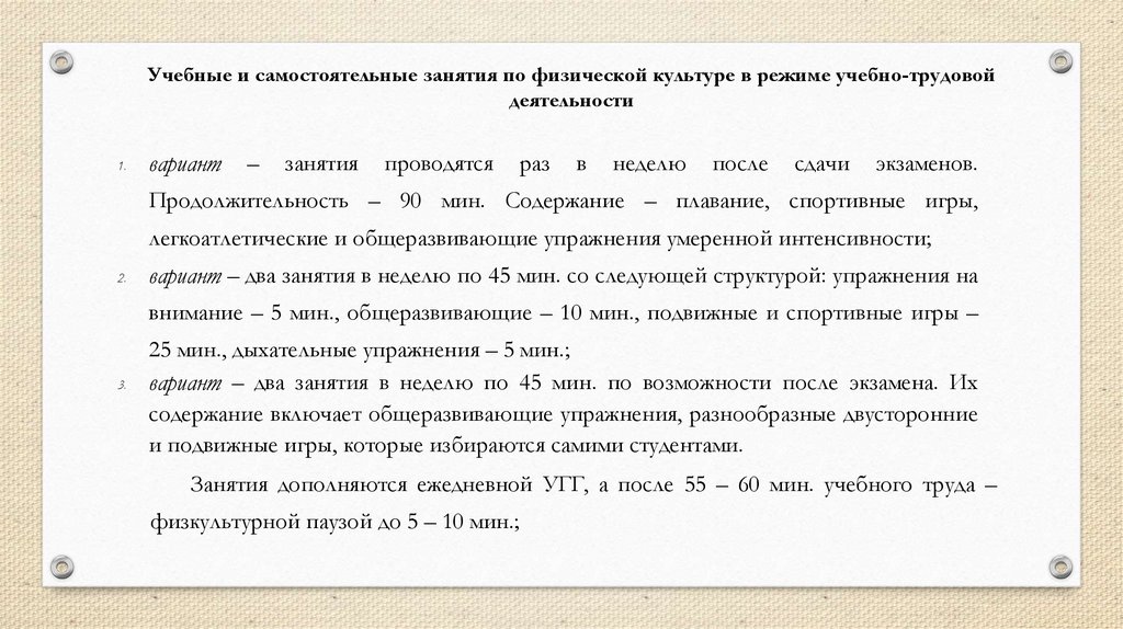 Учебные и самостоятельные занятия по физической культуре в режиме учебно-трудовойдеятельности
