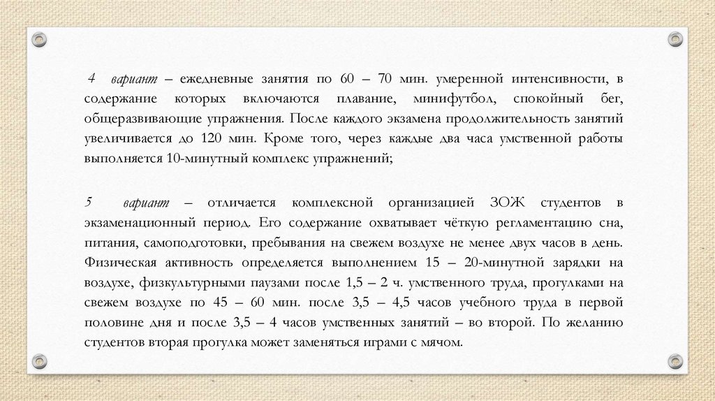 4 вариант – ежедневные занятия по 60 – 70 мин. умеренной интенсивности, всодержание которых включаются плавание, минифутбол, спокойный бег,
