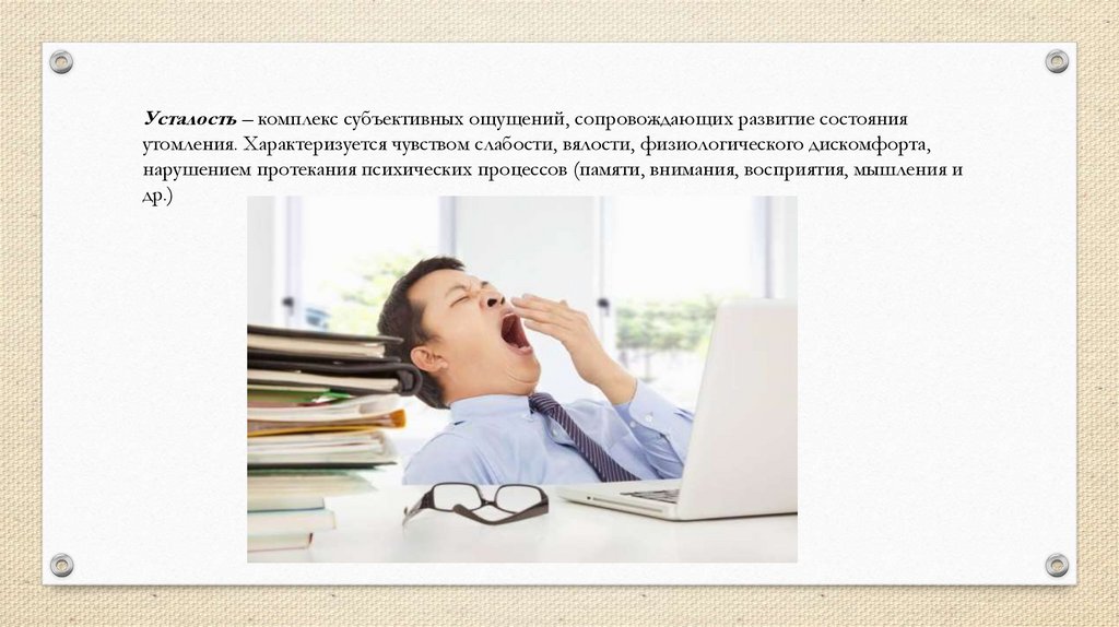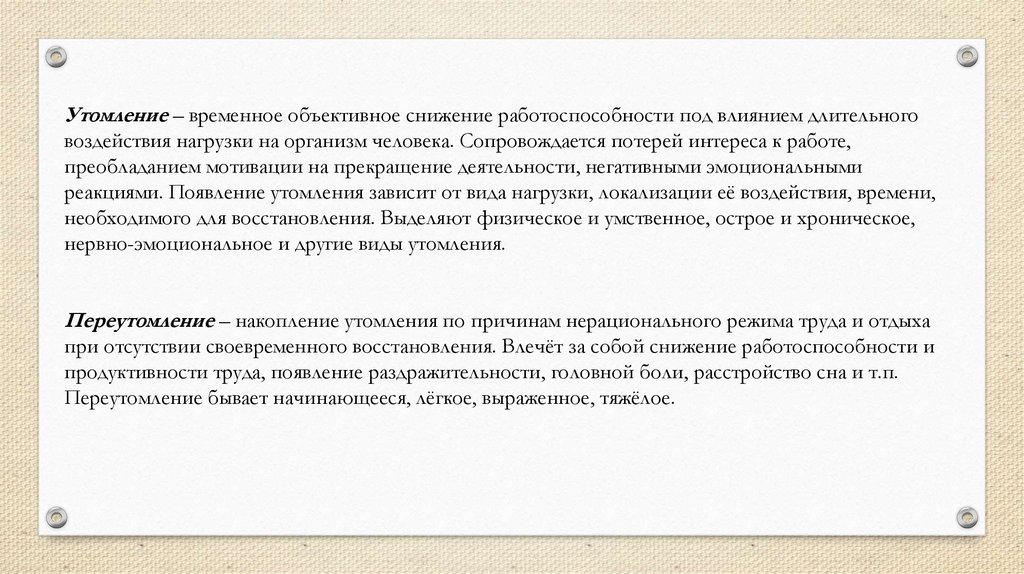 Утомление – временное объективное снижение работоспособности под влиянием длительноговоздействия нагрузки на организм человека. Сопровождается потерей интереса к работе,