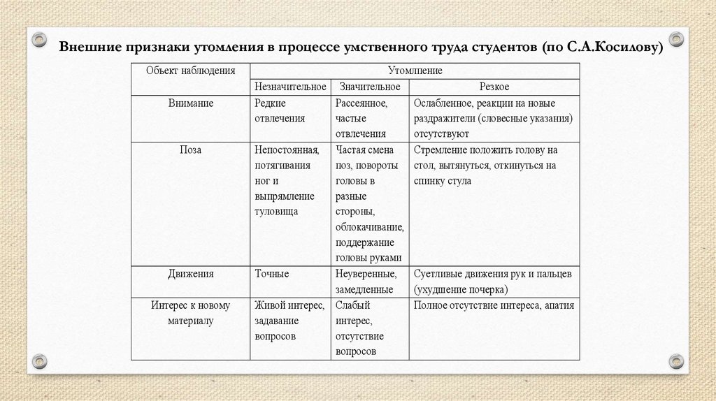 Внешние признаки утомления в процессе умственного труда студентов (по С.А.Косилову)Объект наблюдения