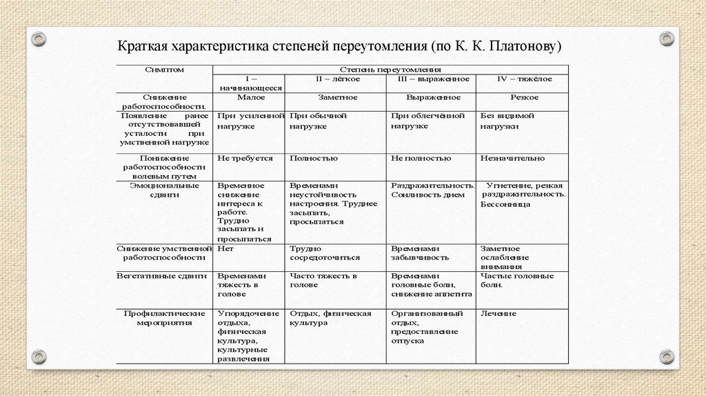 Краткая характеристика степеней переутомления (по К. К. Платонову)Симптом