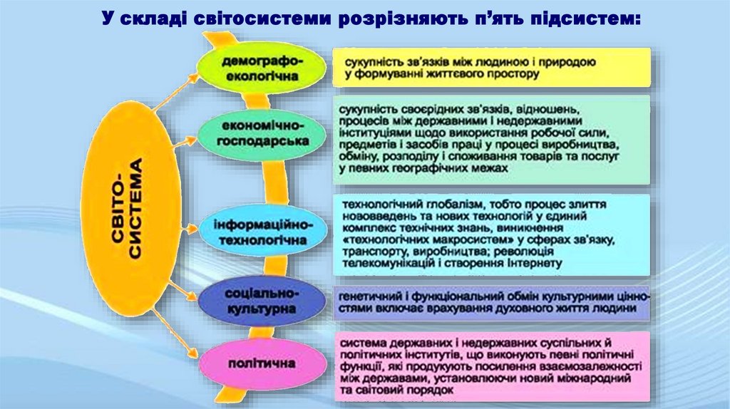 • У складі світосистеми розрізняють п’ять підсистем: