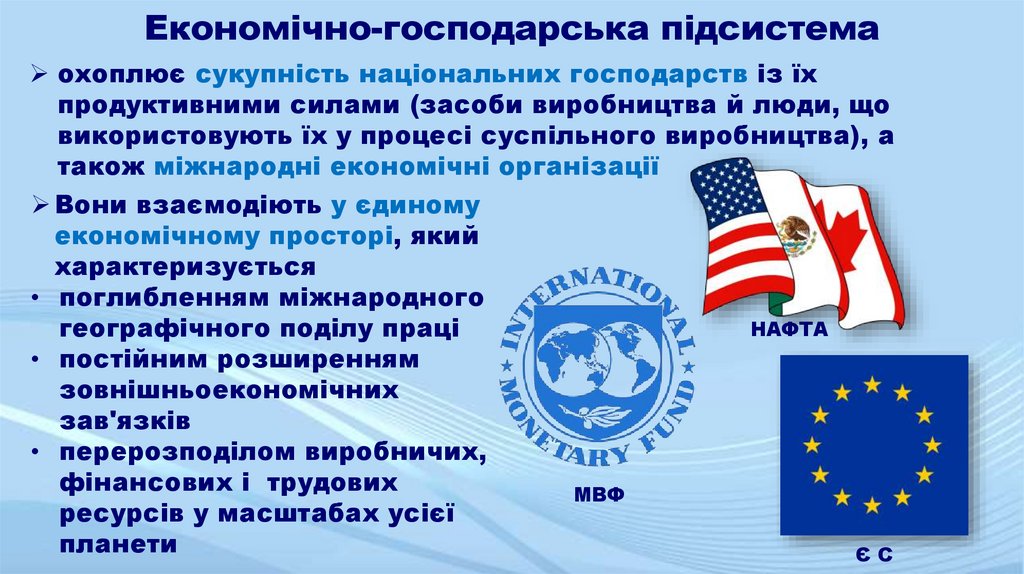 Економічно-господарська підсистемаохоплює сукупність національних господарств із їх