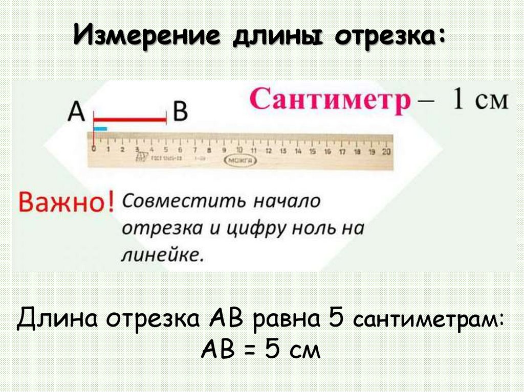 Измерение длины отрезка:Длина отрезка АВ равна 5 сантиметрам: