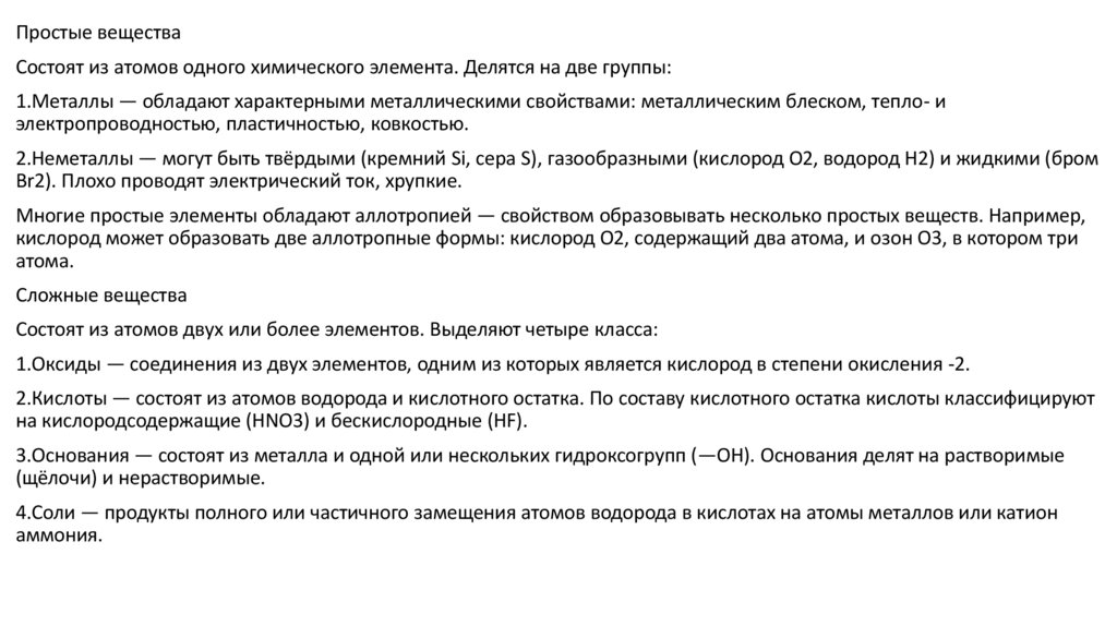 Простые веществаСостоят из атомов одного химического элемента. Делятся на две группы: