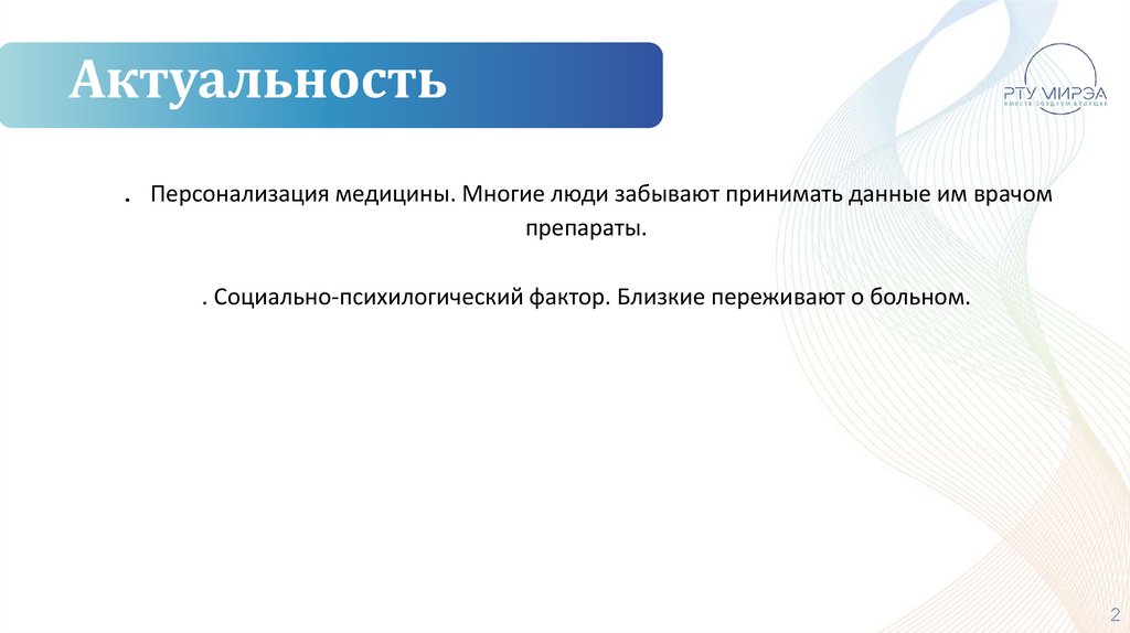 Актуальность. Персонализация медицины. Многие люди забывают принимать данные им врачом
