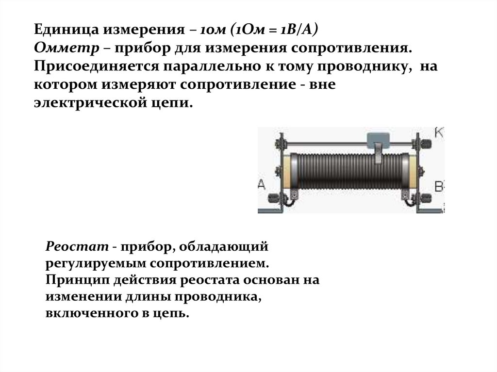 Единица измерения – 1ом (1Ом = 1В/А)Омметр – прибор для измерения сопротивления.