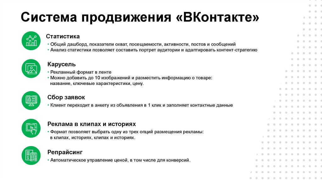 • Общий дашборд, показатели охват, посещаемости, активности, постов и сообщений
