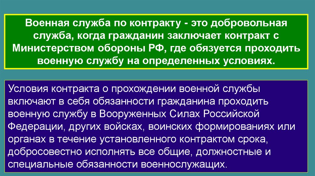 Военная служба по контракту - это добровольнаяслужба, когда гражданин заключает контракт с