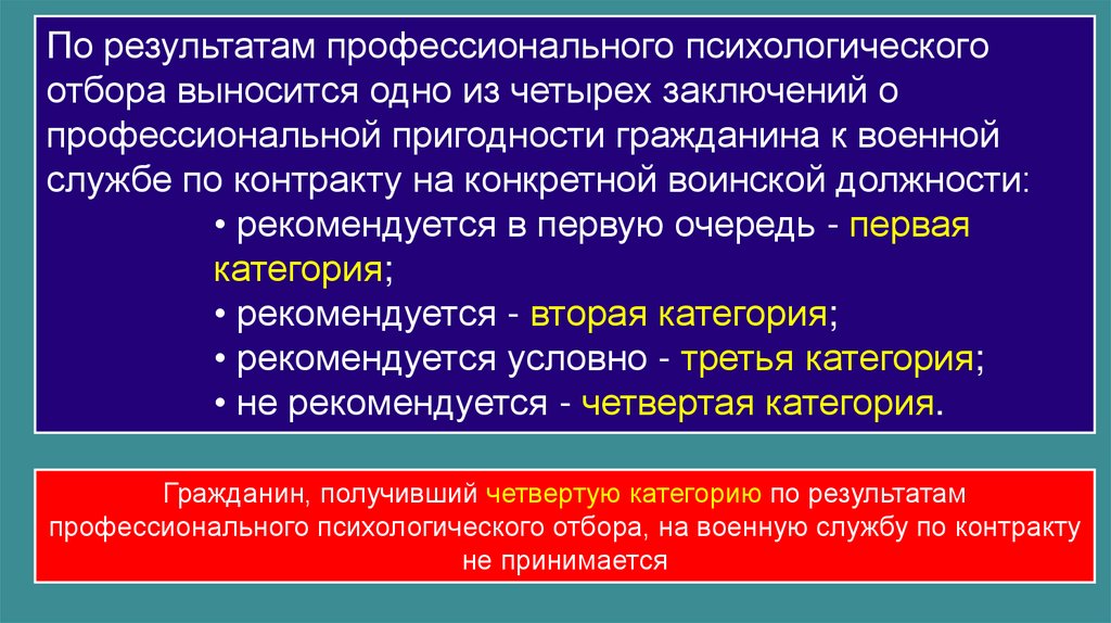 По результатам профессионального психологическогоотбора выносится одно из четырех заключений о