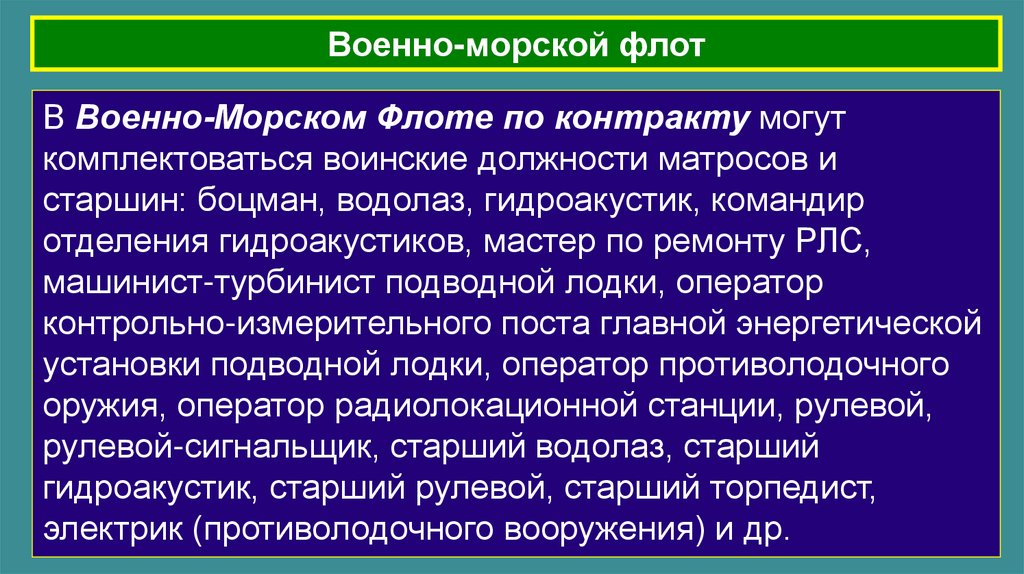 Военно-морской флотВ Военно-Морском Флоте по контракту могут
