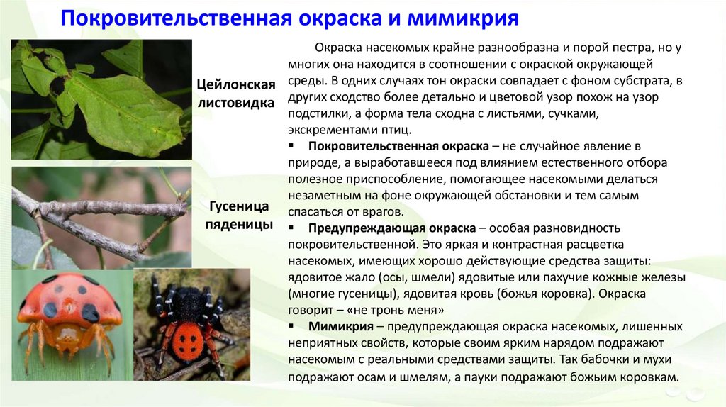 Покровительственная окраска и мимикрияОкраска насекомых крайне разнообразна и порой пестра, но у