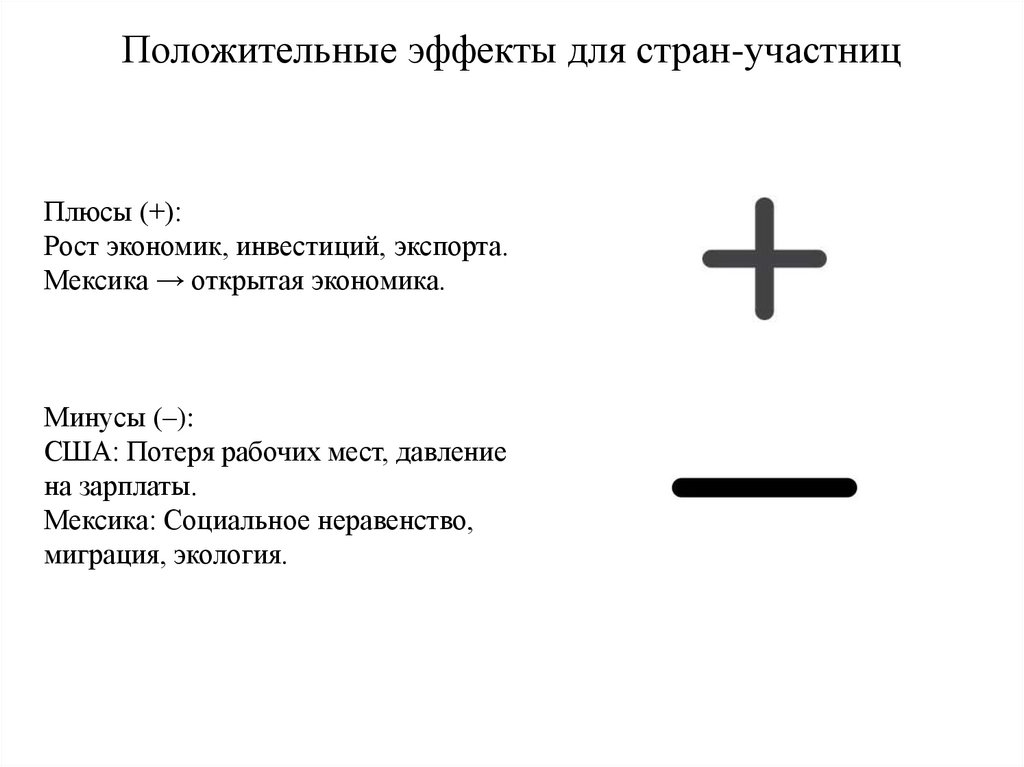 Страны-участницы: США, Канада, Мексика.Даты: Подписано 1992 году, вступило в силу 1 января 1994 года.