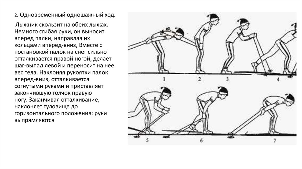 • 1. Одновременный бесшажный.• Передвигаясь этим ходом, лыжник