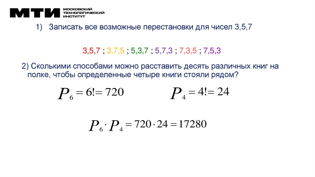 1) Записать все возможные перестановки для чисел 3,5,73,5,7 ; 3,7,5 ; 5,3,7 ; 5,7,3 ; 7,3,5 ; 7,5,3