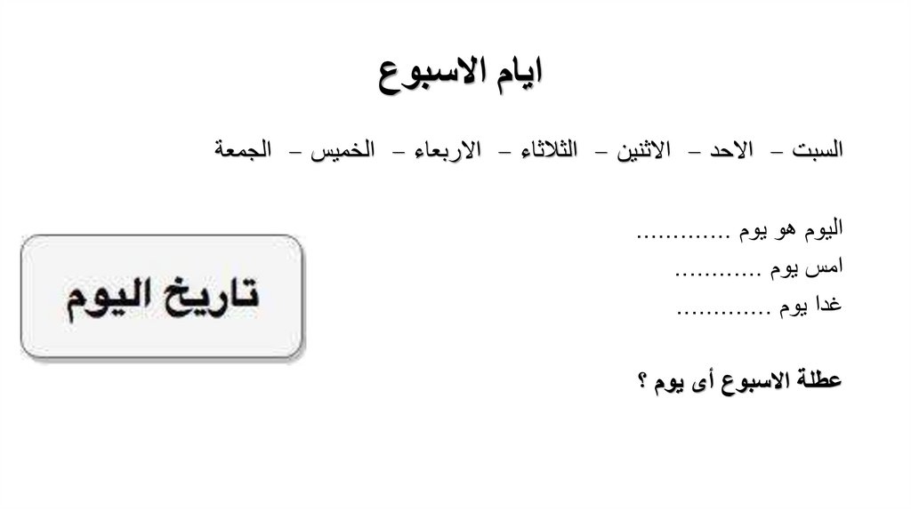ايام االسبوعالسبت – االحد – االثنين – الثالثاء – االربعاء – الخميس – الجمعة