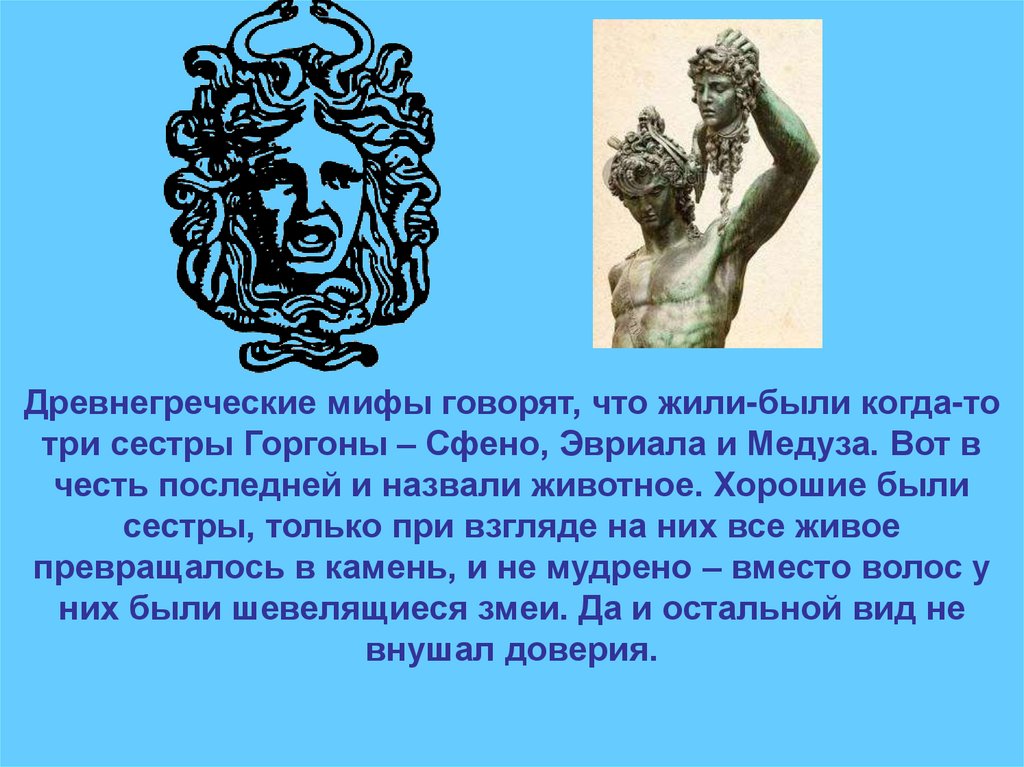 Древнегреческие мифы говорят, что жили-были когда-тотри сестры Горгоны – Сфено, Эвриала и Медуза. Вот в