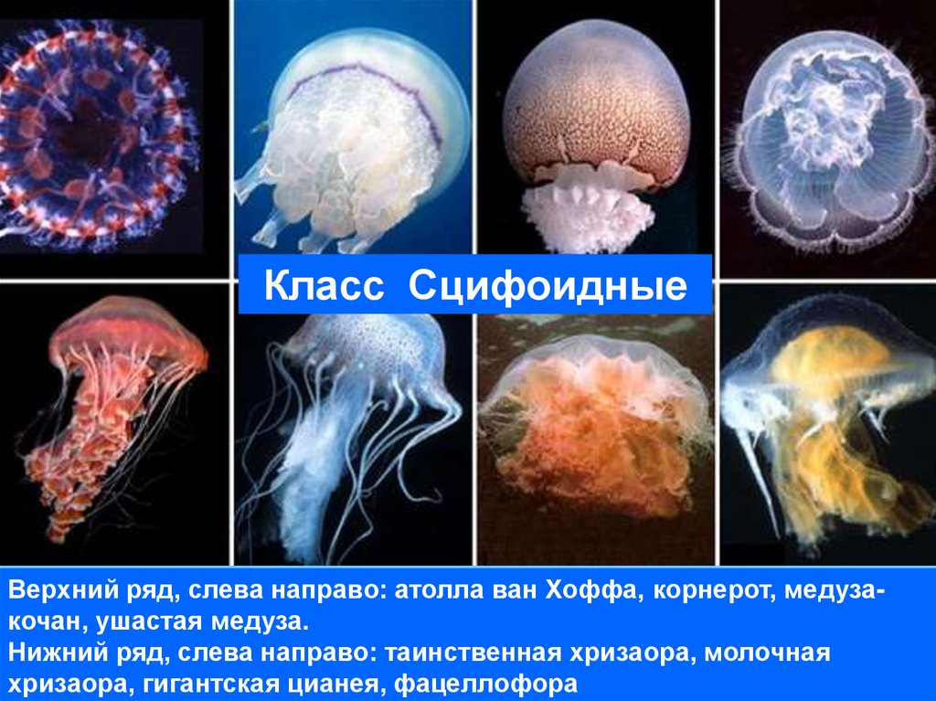 Класс СцифоидныеВерхний ряд, слева направо: атолла ван Хоффа, корнерот, медузакочан, ушастая медуза.