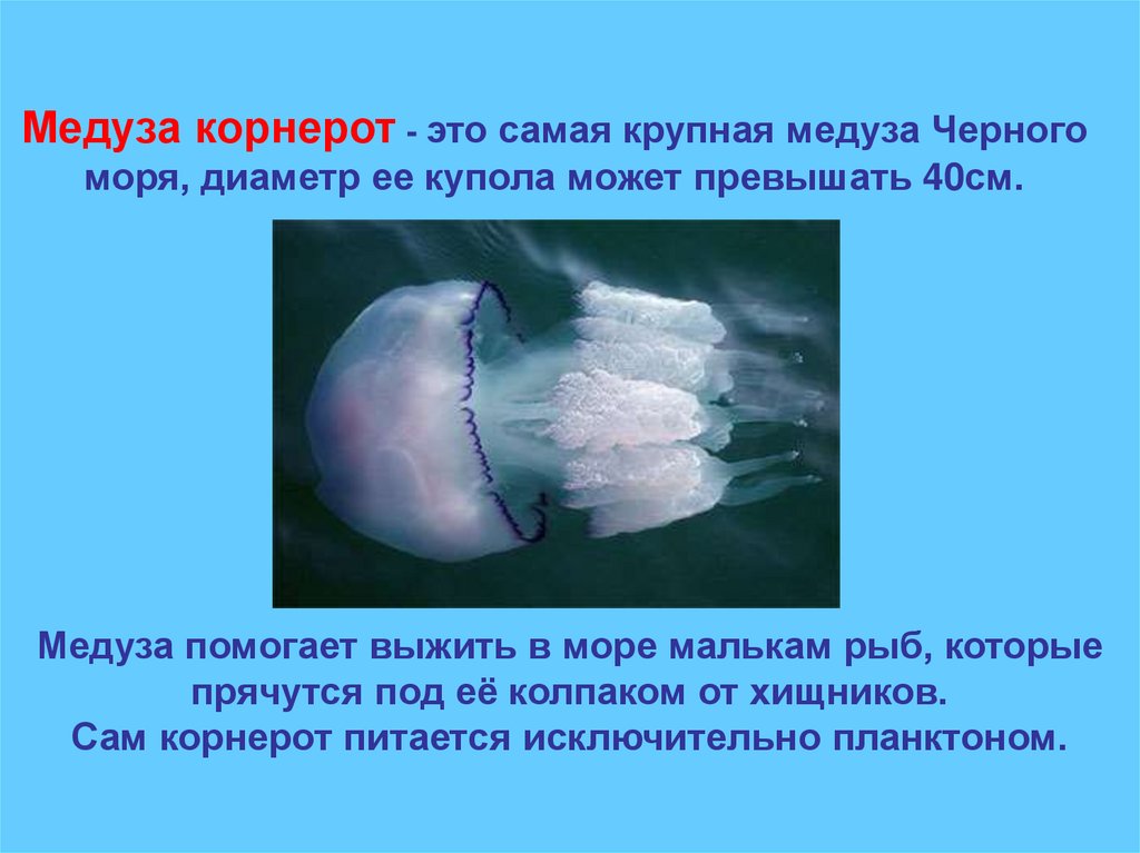 Медуза корнерот - это самая крупная медуза Черногоморя, диаметр ее купола может превышать 40см.