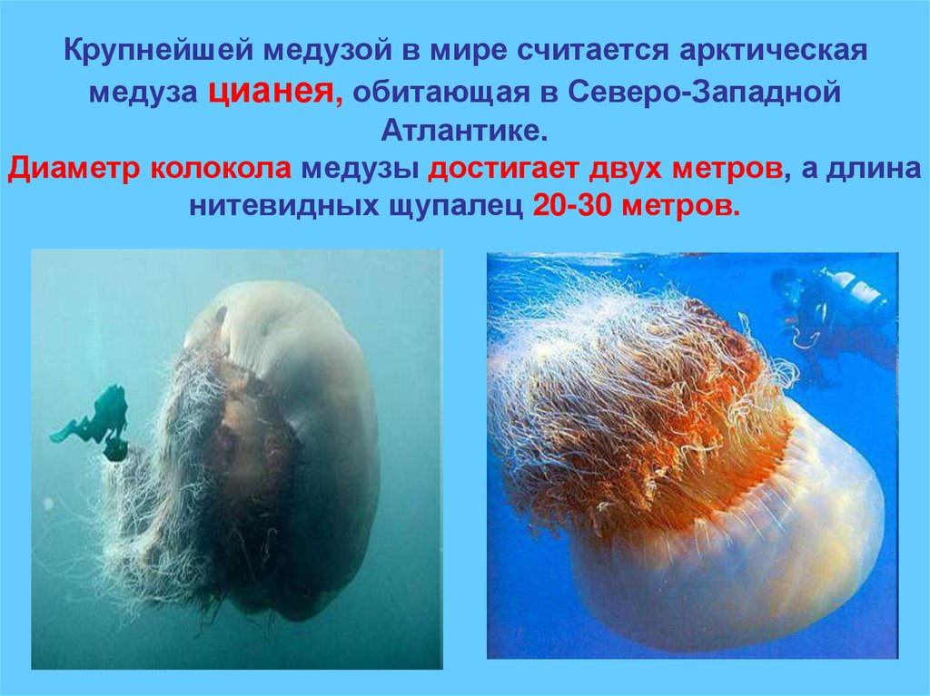 Крупнейшей медузой в мире считается арктическаямедуза цианея, обитающая в Северо-Западной