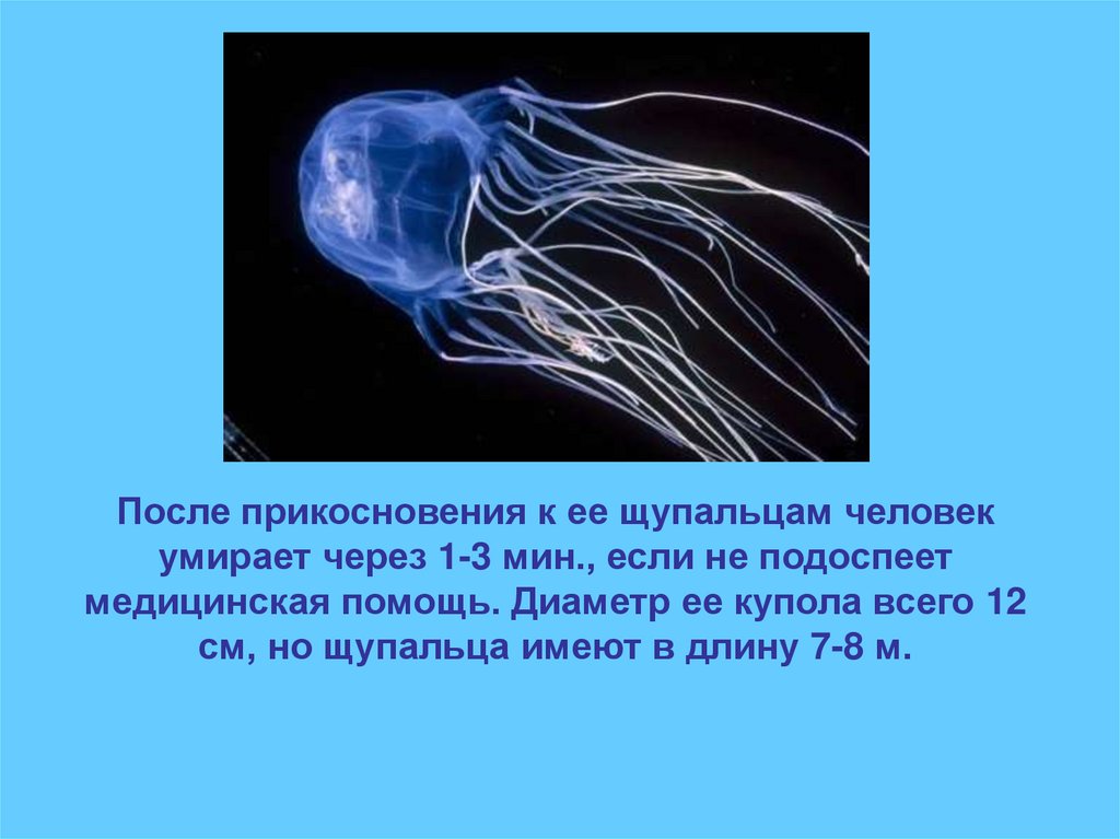После прикосновения к ее щупальцам человекумирает через 1-3 мин., если не подоспеет