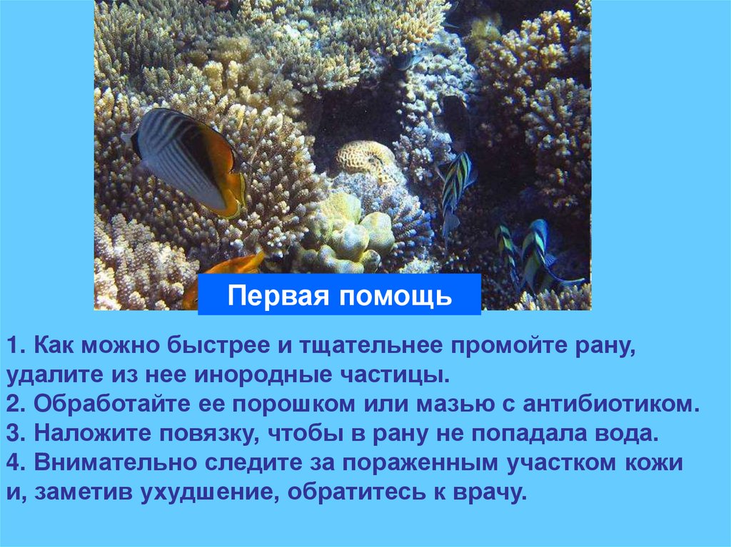 Первая помощь1. Как можно быстрее и тщательнее промойте рану,