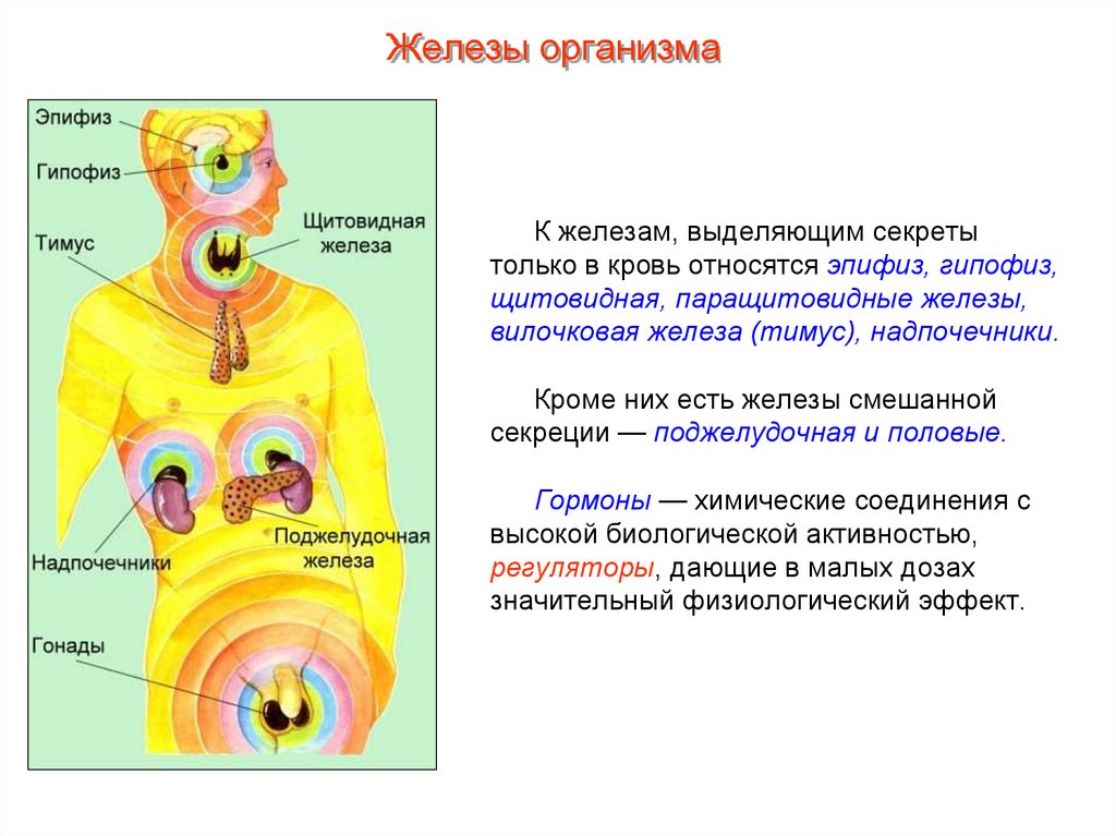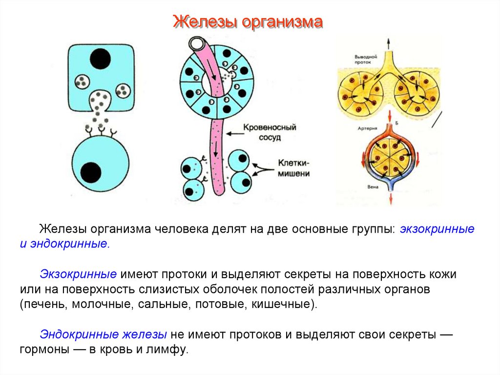 потовые, печень и др.). Железы вырабатывают различные секреты: