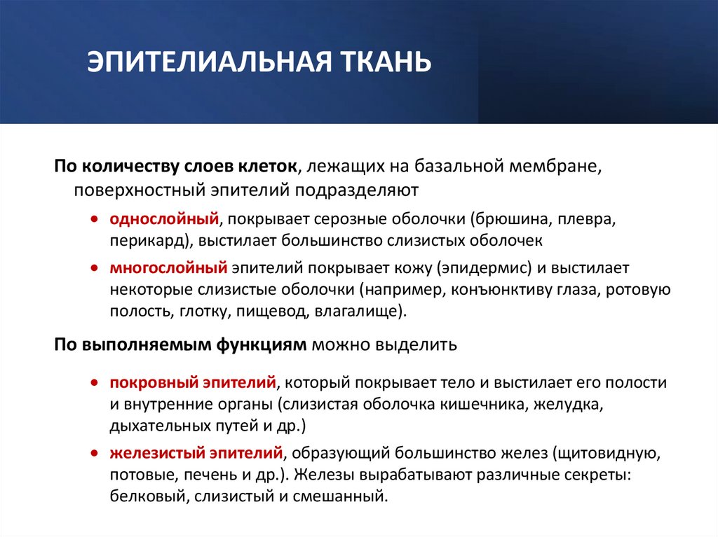 ЭПИТЕЛИАЛЬНАЯ ТКАНЬПо количеству слоев клеток, лежащих на базальной мембране,