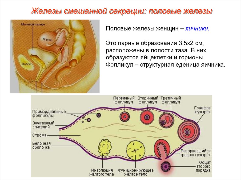 Железы смешанной секреции: половые железыПоловые железы женщин – яичники.