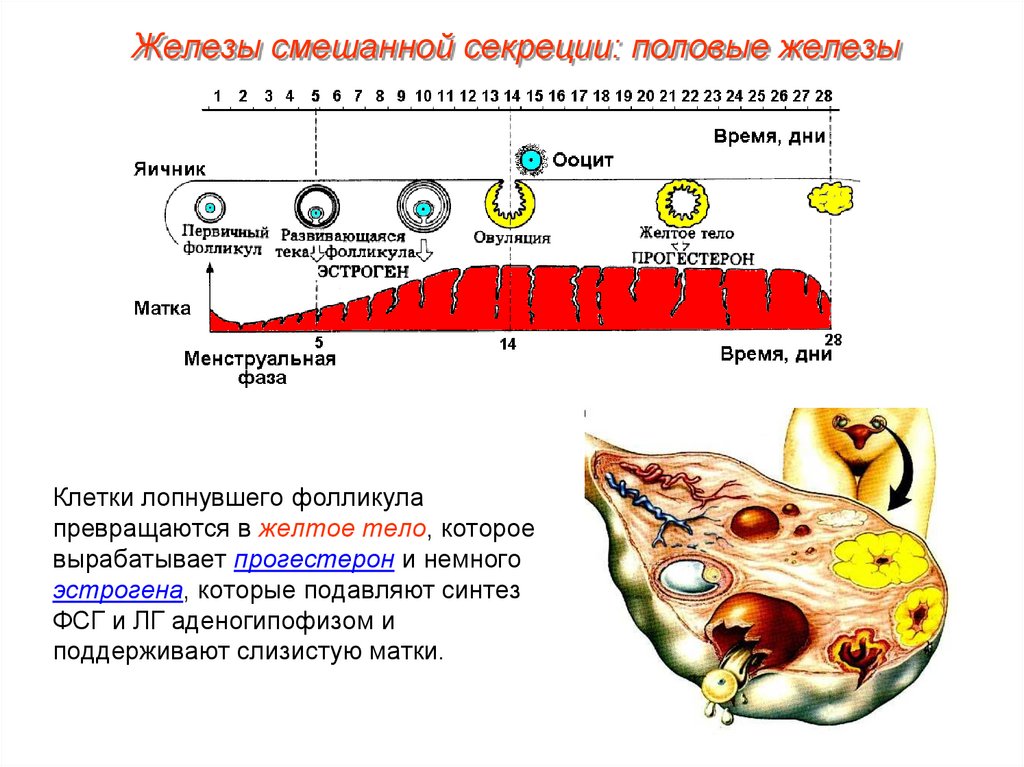 Железы смешанной секреции: половые железыКлетки лопнувшего фолликула