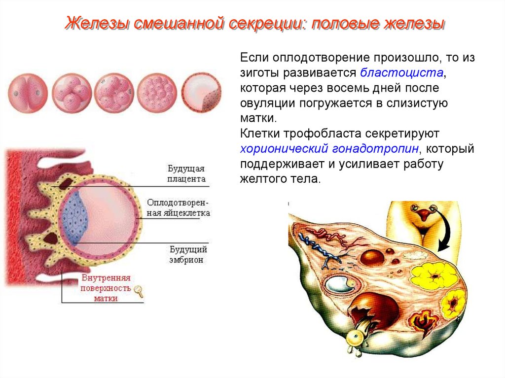Железы смешанной секреции: половые железыЕсли оплодотворение произошло, то из