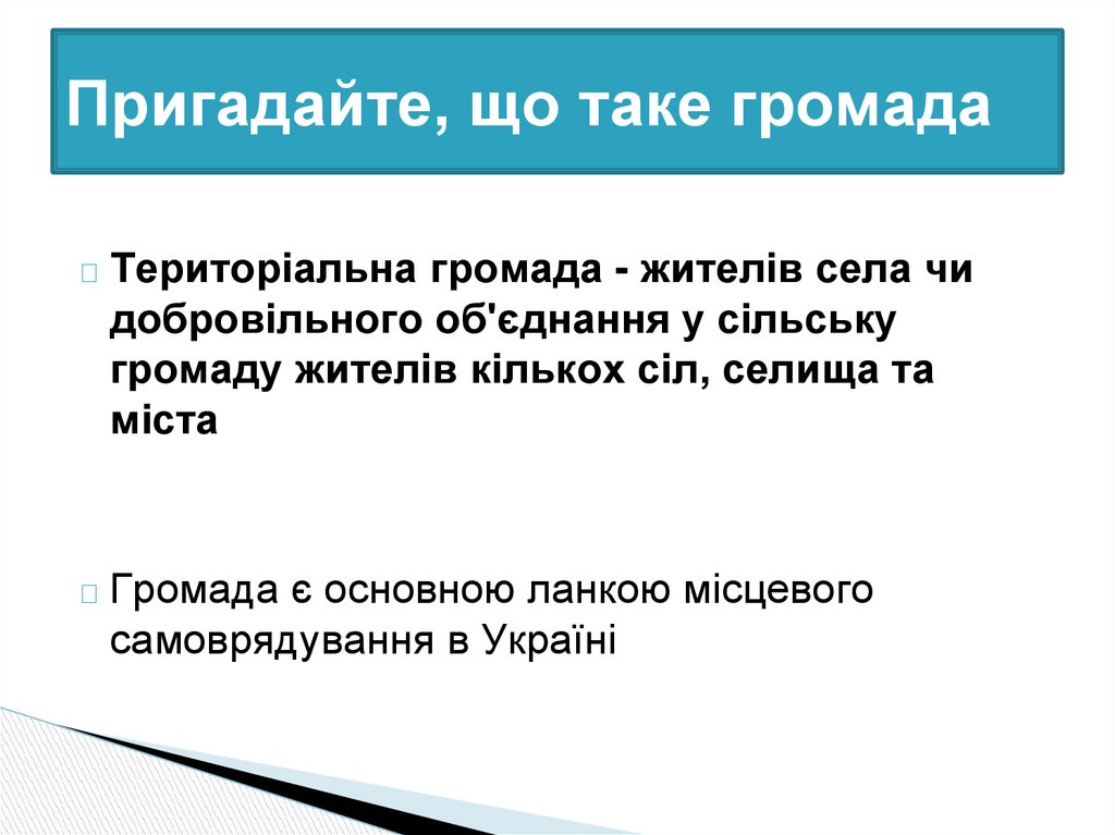 Пригадайте, що таке громадаТериторіальна громада - жителів села чи