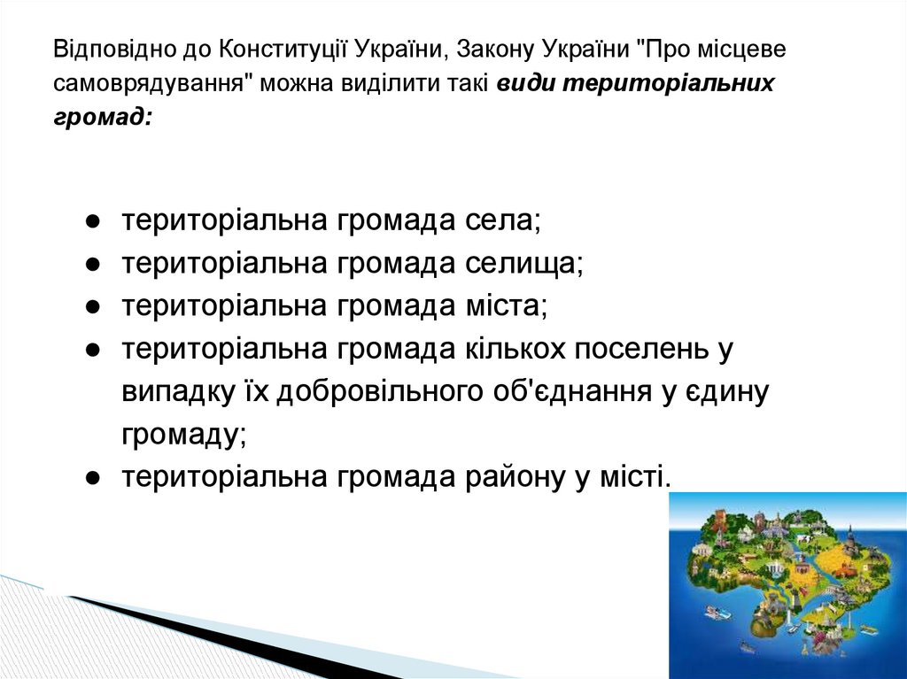 Відповідно до Конституції України, Закону України "Про місцевесамоврядування" можна виділити такі види територіальних