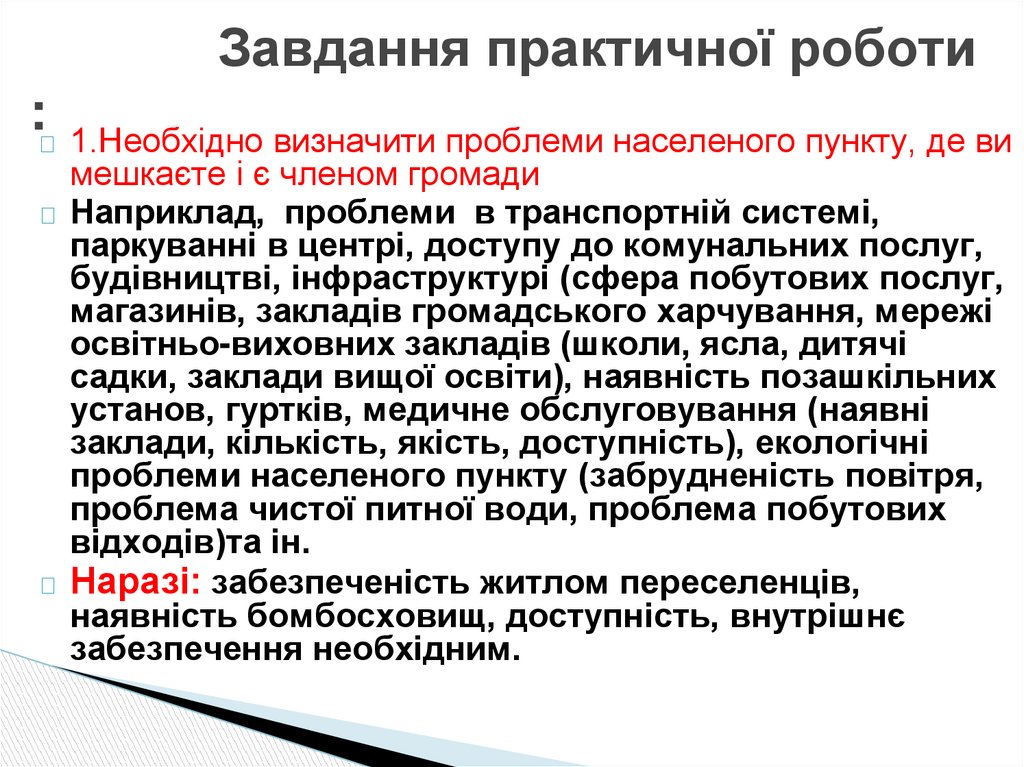 Завдання практичної роботи: 1.Необхідно визначити проблеми населеного пункту, де ви