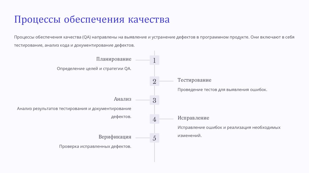 Процессы обеспечения качестваПроцессы обеспечения качества (QA) направлены на выявление и устранение дефектов в программном продукте. Они включают в себя