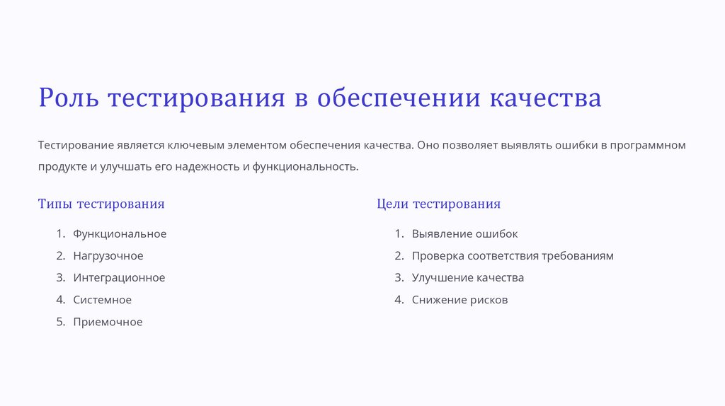 Роль тестирования в обеспечении качестваТестирование является ключевым элементом обеспечения качества. Оно позволяет выявлять ошибки в программном