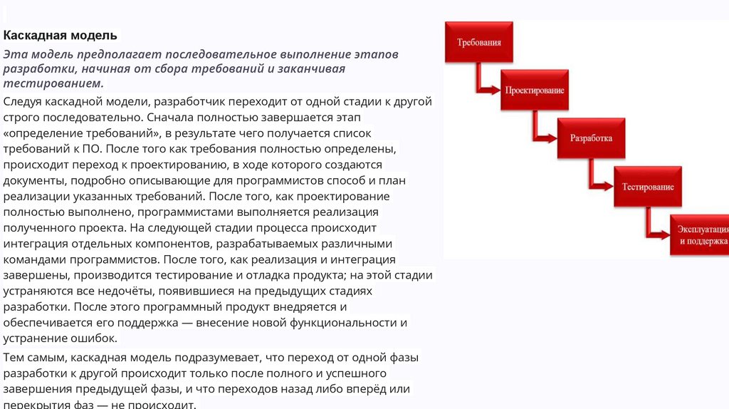 Каскадная модельЭта модель предполагает последовательное выполнение этапов