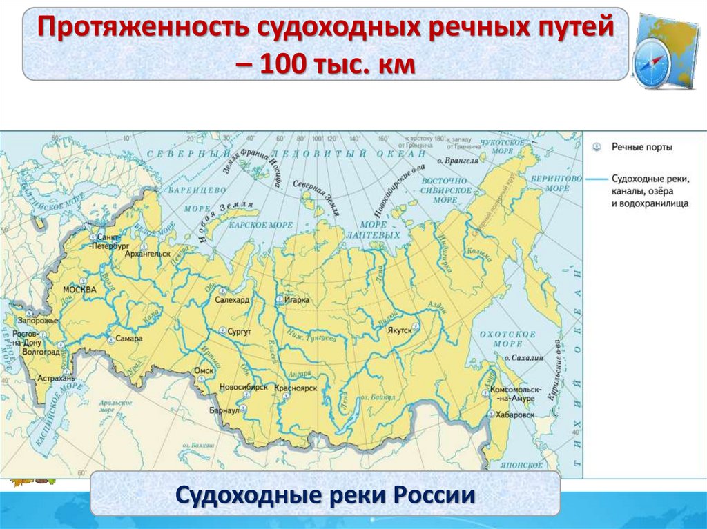 Протяженность судоходных речных путей– 100 тыс. км