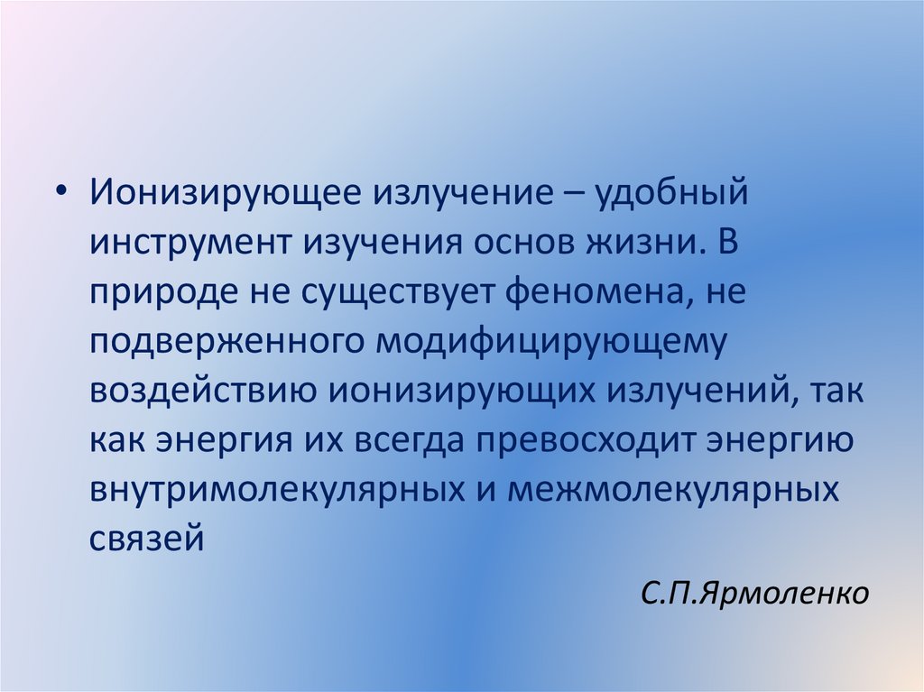 • Ионизирующее излучение – удобныйинструмент изучения основ жизни. В