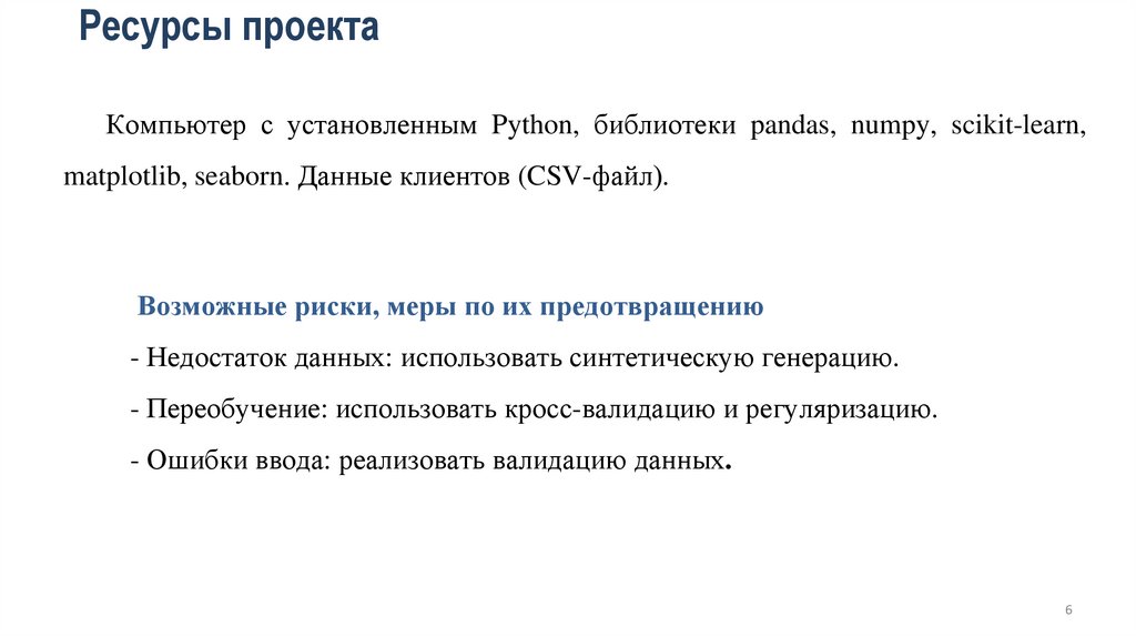 Ресурсы проектаКомпьютер с установленным Python, библиотеки pandas, numpy, scikit-learn,
