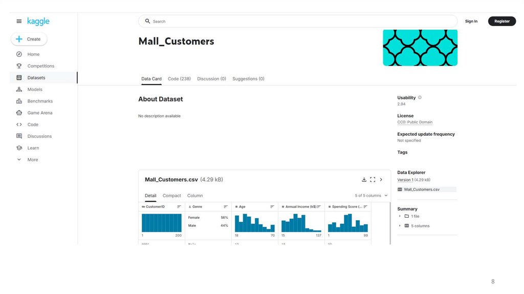 Mall_Customers / [Электронный ресурс] // : [сайт]. — URL: https://www.kaggle.com/datasets/shwetabh123/mallcustomers (дата обращения: 29.11.2025).