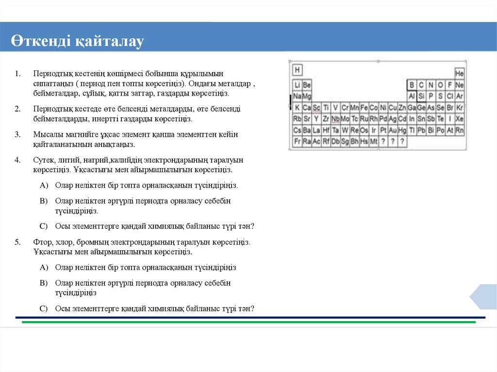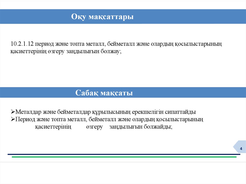 Оқу мақсаттары10.2.1.12 период және топта металл, бейметалл және олардың қосылыстарының