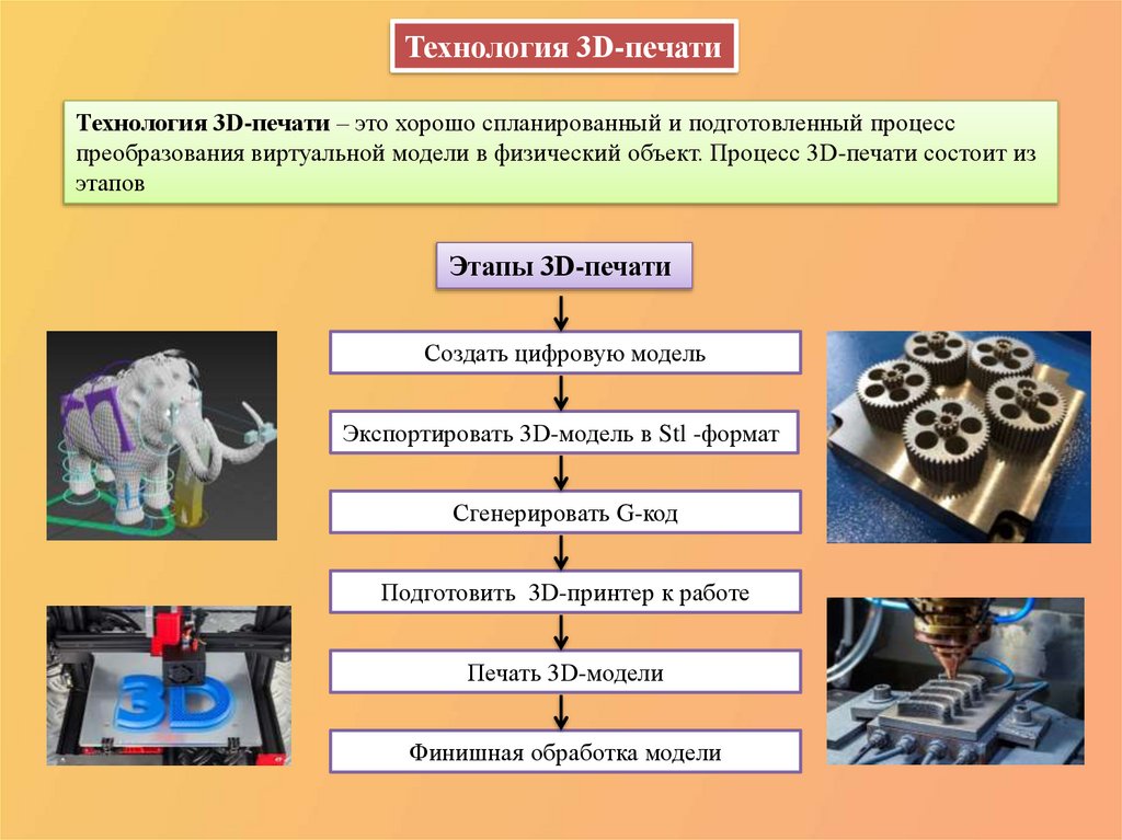 преобразования виртуальной модели в физический объект. Процесс 3D-печати состоит из