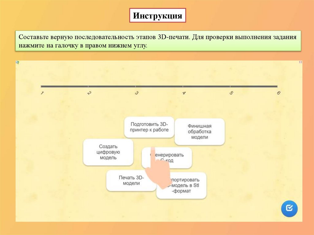ИнструкцияСоставьте верную последовательность этапов 3D-печати. Для проверки выполнения задания
