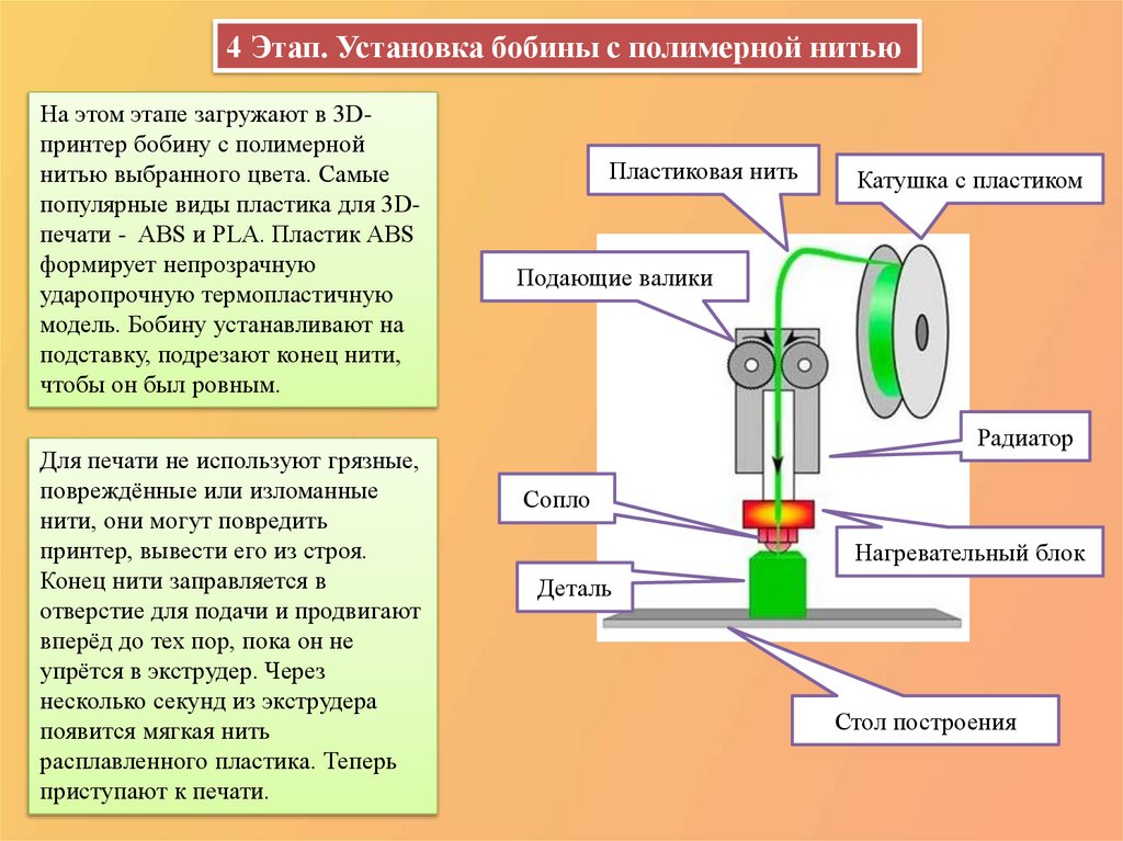 4 Этап. Установка бобины с полимерной нитьюНа этом этапе загружают в 3Dпринтер бобину с полимерной