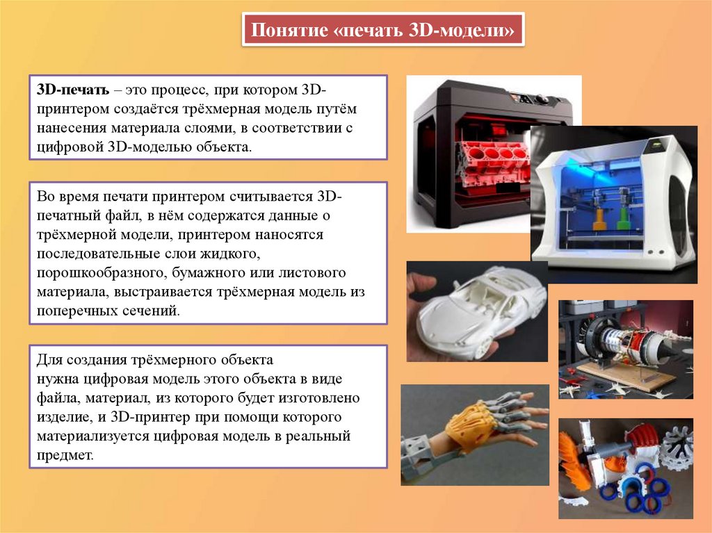 Понятие «печать 3D-модели»3D-печать – это процесс, при котором 3Dпринтером создаётся трёхмерная модель путём