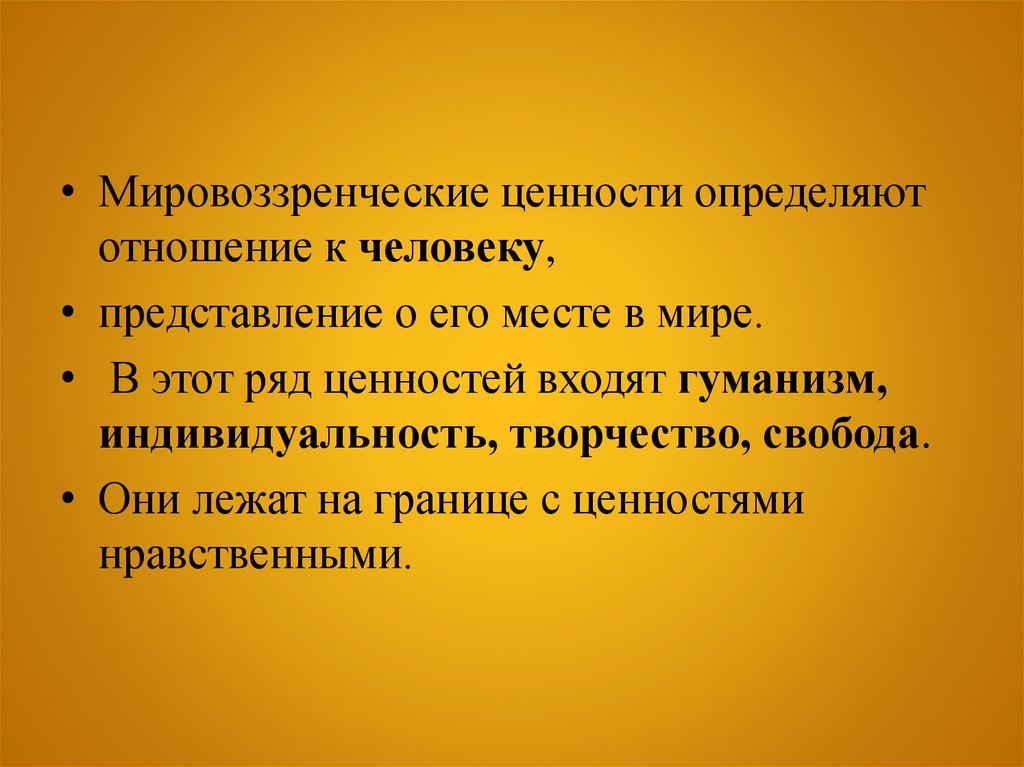 • Мировоззренческие ценности определяютотношение к человеку,
