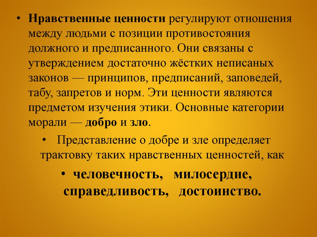 • Нравственные ценности регулируют отношениямежду людьми с позиции противостояния