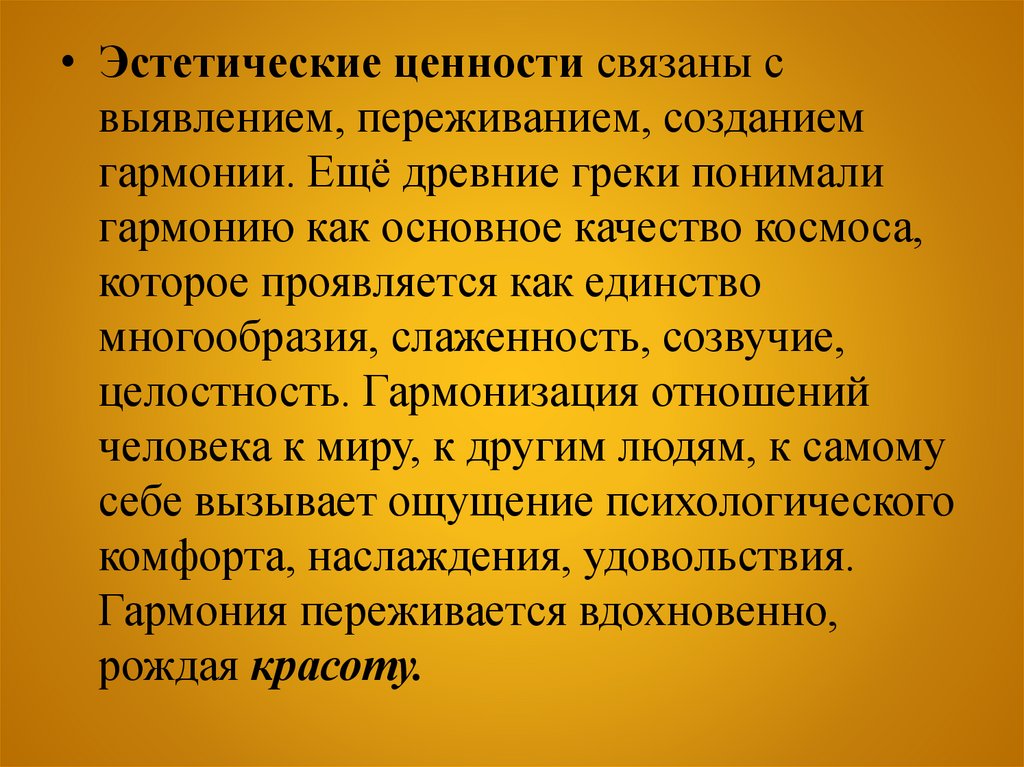 • Эстетические ценности связаны свыявлением, переживанием, созданием