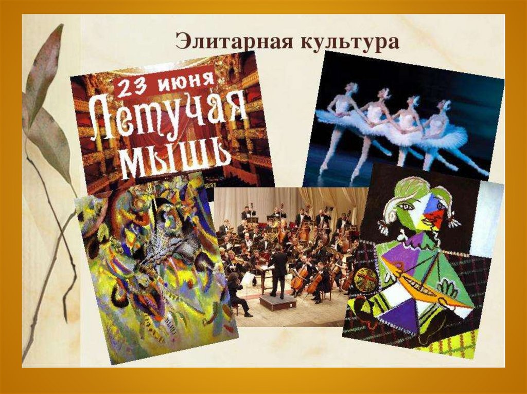 • Элитарная, или высокая, культура создаётсяпривилегированной частью общества либо